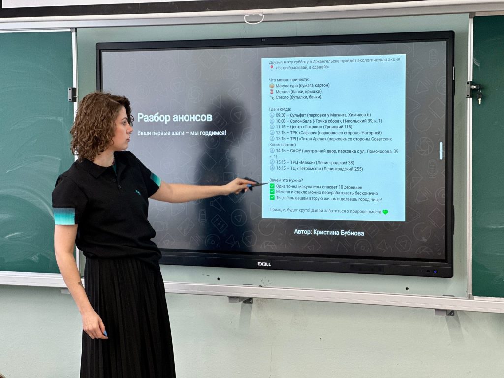 Первое занятие было посвящено основам обращения с отходами. Куратор проекта, заместитель генерального директора Архангельского экологического оператора Евгения Протасова, познакомила ребят с работой системы ТКО в регионе, объяснила принципы раздельного сбора и путь вторсырья от контейнера до переработки. Акцент был сделан на том, как экологические темы могут становиться основой для увлекательного контента.
