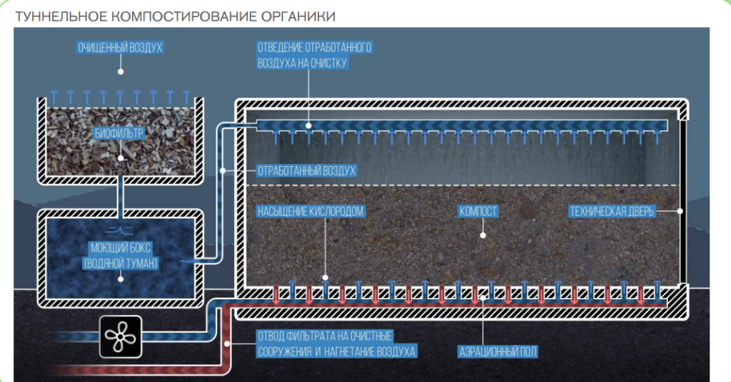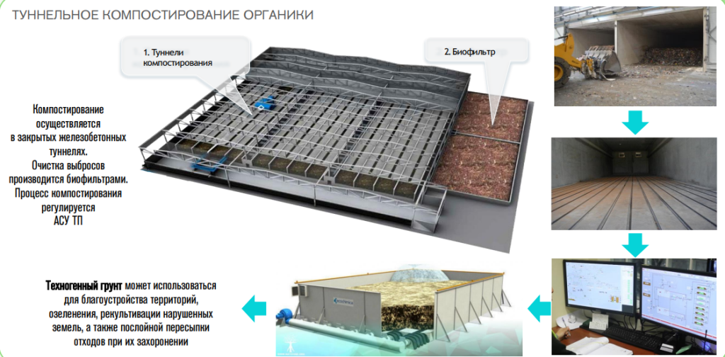 В результате в ходе процесса туннельного компостирования органические отходы в герметичных железобетонных камерах превращаются в техногрунт двух марок: «С» – для рекультивации и дорожного строительства, и «В» – для лесного и сельского хозяйства. Процесс полностью автоматизирован.